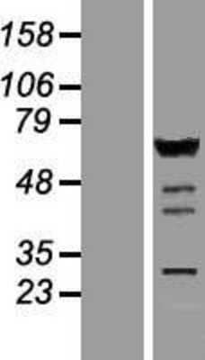 This product is intended for use as a positive control in Western Blot. Overexpression of the target protein was confirmed using an antibody to DDK (FLAG) epitope tag ( NBP1-71705) present on the protein construct. Each vial of cell lysate contains 100ug of total protein which should be sufficient for 20-50 reactions. Depending on over-expression level, antibody affinity and detection system, some lysates can go as low as 0.1 ug per load. We recommend starting with 5ug of cell lysate. Add an equal amount of cell lysate and 2X SDS Sample buffer and boil the SDS samples for 10 minutes before loading. |