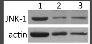 | Specificity | Detects human JNK1 in direct ELISAs and human, mouse, and rat JNK1 expressed predominantly as p46 JNK (isoforms 2 and/or 3, both 384 aa), with lesser amounts of p54 JNK (isoforms 1 and/or 4, both 427 aa), in Western blots. In Western blots, no cross-reactivity with recombinant human (rh) JNK2 or rhJNK3 is observed. |