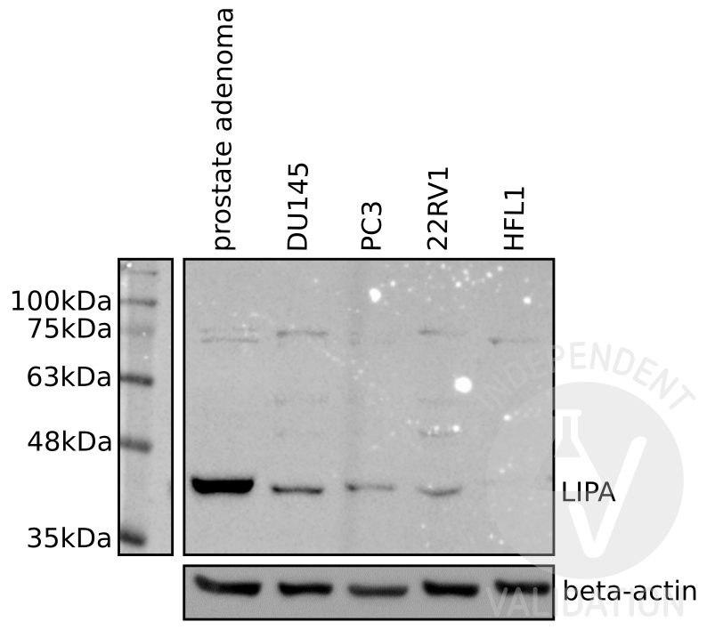 Positive control: Human prostate adenoma tissue, DU145, PC3, and 22RV1 prostate cancer cell line lysates Negative control: HFL1 primary human fibroblasts extract 20µg/lane protein Incubate with primary rabbit anti-LIPA primary antibody (Novus Biologicals, NBP1-54155, lot A-4) diluted at 1:5000 in 3% TBS-T/BSA ON at 4°C. Incubate with secondary goat anti-rabbit/HRP-conjugated antibody (Bio-Rad, cat 1706515) diluted 1:3000 in 3% TBS-T/BSA for 1h-2h at RT. Image acquisition 30 sec exposure Strip membrane Incubate membrane with primary mouse beta-Actin loading control antibody (Novus Biologicals, NB600501, lot 64M4789V) diluted at 1:5000 in 3% TBS-T/BSA and with secondary anti-mouse/HRP-conjugated antibody (Bio-Rad, 170547) at 1:3000 in 3% TBS-T/BSA. Image acquisition 30 sec exposure Experimental notes & Conclusion: NBP1-54155 revealed a strong specific band at the expected molecular weight for Lipase A at 45kDa in different lysates of human cancer cell lines. The protein bands were visible in the positive but not in the negative controls. Therefore, NBP1-54155 was found to be suitable for checking the expression levels of Lipase A protein. Conclusion Passed. NBP1-54155 specifically reveals LIPA in extracts from human prostate adenoma tissue and prostate cancer cell lines DU145, PC3, and 22RV1.