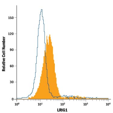 LRIG1 (Leucine-rich Repeats and Ig-like domains-1), also known as LIG-1, is an approximately 130-145 kDa glycoprotein that belongs to the LRIG gene family. It is widely expressed, and appears on the surface of prostatic epithelium, endothelial cells, vascular and visceral smooth muscle, mammary epithelium, cardiac muscle, keratinocytes and neurons. LRIG1 is believed to negatively regulate the ErbB family of receptors. In particular, and in a ligand-independent manner, LRIG1 complexes with all four ErbBs, promoting their ubiquitination and decreasing their number. Alternatively, LRIG1 is suggested to bind to the ErbBs, preventing their dimerization and signal transduction. Mature mouse LRIG1 is a 1057 amino acid (aa) type I transmembrane protein. It contains a large 762 amino acid (aa) extracellular domain (ECD) (aa 35-795) plus a 274 aa cytoplasmic region. The ECD contains 17 LRRs (aa’s 35-491) and three C2-type Ig-like domains (aa’s 497-781). These two domain types are each sufficient for EGFR binding. There one potential alternative splice form that a deletion of aa 875-923. The LRIG1 ECD undergoes proteolysis, generating 90-105 and 60-70 kDa soluble fragments. Over aa 37-794, human LRIG1 shares 97% and 90% aa sequence identity with rat and human LRIG1, respectively.