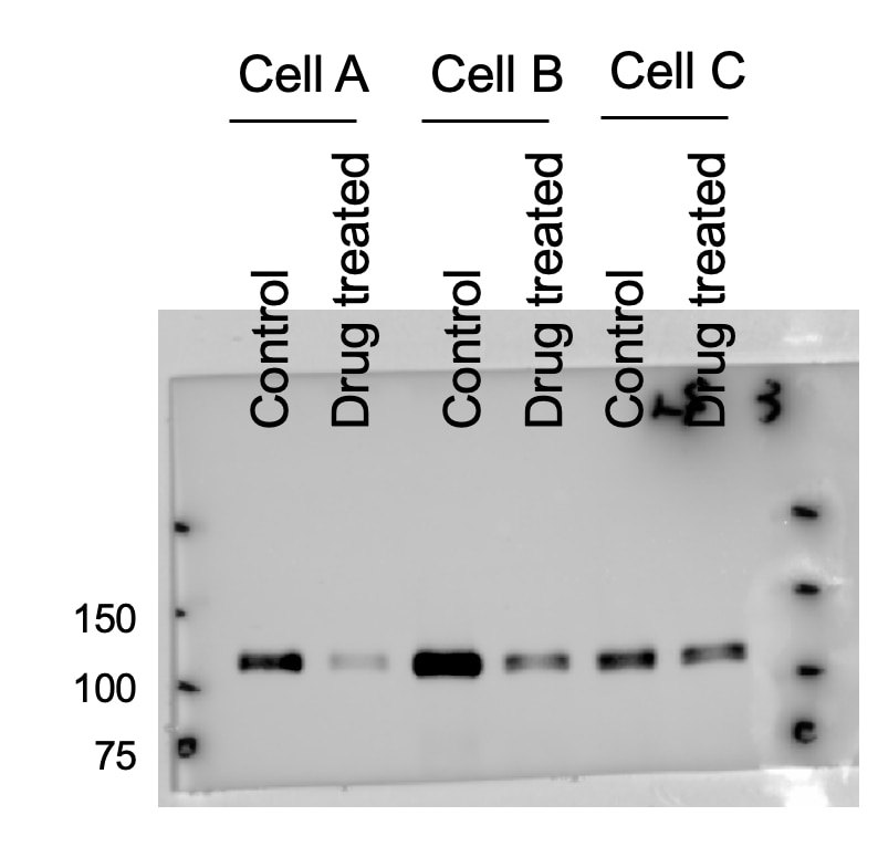 In Simple Western only 10 - 15 uL of the recommended dilution is used per data point. See Simple Western Antibody Database for Simple Western validation: Tested in HeLa lysate 0.5 mg/mL, separated by Size, antibody dilution of 1:500, apparent MW was 120 kDa. Separated by Size-Wes, Sally Sue/Peggy Sue. The observed molecular weight of the protein may vary from the listed predicted molecular weight due to post translational modifications, post translation cleavages, relative charges, and other experimental factors.
