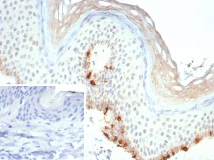 | Specificity | This antibody recognizes a protein doublet of 20-22kDa, identified as MART-1 (Melanoma Antigen Recognized by T cells 1) or Melan-A. This monoclonal antibody labels melanomas and other tumors showing melanocytic differentiation. It is also a useful positive-marker for angiomyolipomas. It does not stain tumor cells of epithelial, lymphoid, glial, or mesenchymal origin. |