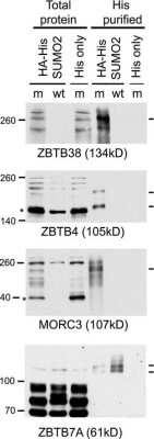 Biological Strategies: Western Blot: MORC3 Antibody [NBP1-83036] - Total and purified protein fractions from mock (m) & wt HSV-1 (wt; MOI 10 12 h p.i.) infected HA-HisSUMO2 cells analyzed by WB (uninfected HA-His ...read more