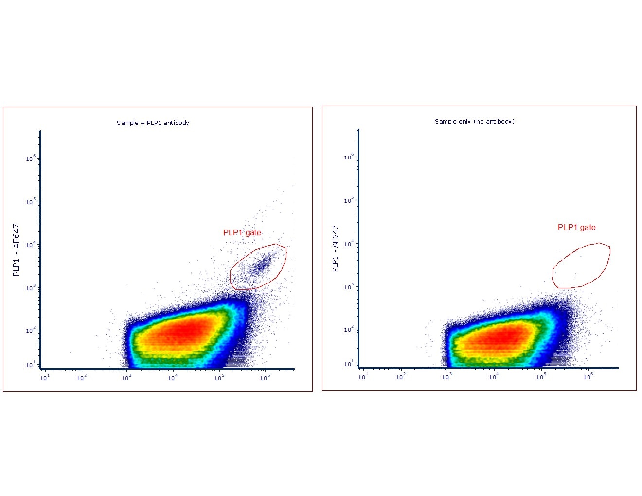 ***Bio-Techne Response: This review was submitted through the legacy Novus Innovators Program, reflecting a new species or application tested on a primary antibody.*** 10ul of pre-isolated extracellular vesicles were incubated with 2ul of PLP1-AF647 antibody, during 20 minutes at room temperature, and analyzed in nanoscale flow cytometer able to resolve particles scattering as little as 100um. Despite some background noise possibly given to antibody aggregation (common in such sensitive application), the antibody performed well to detect PLP1+exosomes.