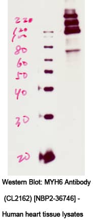 | Description | Novus Biologicals Mouse MYH6 Antibody (CL2162) - BSA Free (NBP2-36746) is a monoclonal antibody validated for use in IHC and WB. All Novus Biologicals antibodies are covered by our 100% guarantee. |