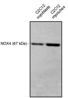 NADPH Oxidase 4/NOX4, also known as Renal NADPH Oxidase/RENOX and Kidney Oxidase 1/KOX1, is a 66 to 75 kDa member of the NOX family of NADPH oxidases. NOX family members are a major source of reactive oxygen species (ROS), including hydrogen peroxide and superoxide, and are critical mediators of redox signaling. NOX4 is strongly expressed in the kidney, especially in the proximal convoluted tubule cells of the renal cortex, and may function as an oxygen sensor that regulates the synthesis of erythropoietin. Expression is also high in endothelial cells, and because aortas from deficient mice exhibit increased inflammation, hypertrophy and endothelial dysfunction, NOX4 may function to protect the vasculature during ischemic or inflammatory stress. Human NOX4 is 578 amino acids (aa) in length, with several additional smaller isoforms identified. Over aa 450-578, human NOX4 has 92% sequence identity with mouse NOX4, and 91% identity with rat NOX4.