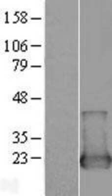 This product is intended for use as a positive control in Western Blot. Overexpression of the target protein was confirmed using an antibody to DDK (FLAG) epitope tag ( NBP1-71705) present on the protein construct. Each vial of cell lysate contains 100ug of total protein which should be sufficient for 20-50 reactions. Depending on over-expression level, antibody affinity and detection system, some lysates can go as low as 0.1 ug per load. We recommend starting with 5ug of cell lysate. Add an equal amount of cell lysate and 2X SDS Sample buffer and boil the SDS samples for 10 minutes before loading. |