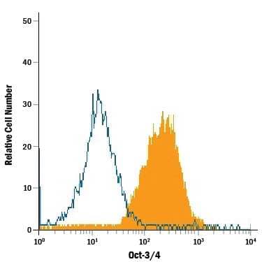 NTERA-2 cells were stained with Rat Anti-Human/Mouse Oct‑3/4 APC‑conjugated Monoclonal Antibody (Catalog # IC1759A, filled histogram) or isotype control antibody (Catalog # IC013A, open ...read more