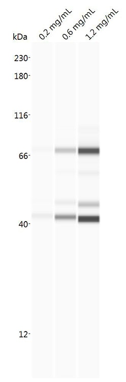 | Application Notes | This Optineurin Antibody is validated for Simple Western from a verified customer review. See Simple Western Antibody Database for Simple Western validation: Tested in THP-1 macrophage lysate 0.2 mg/mL, 0.6 mg/mL and 1.2 mg/mL, separated by Size, antibody dilution of 1:25 |