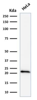 | Application Notes | Use in Western Blot reported in scientific literature (PMID: 33086074). Immunohistochemistry (Formalin-fixed): 2-4ug/ml for 30 minutes at RT. Staining of formalin-fixed tissues requires heating tissue sections in 10mM Tris with 1mM EDTA, pH 9.0, for 45 min at 95C followed by cooling at RT for 20 minutes. Optimal dilution for a specific application should be determined. |