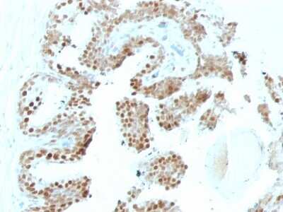 | Specificity | Recognizes a protein of 57kDa, identified as p57Kip2. It shows no cross-reaction with p27Kip1. p57Kip2 is a potent tight-binding inhibitor of several G1 cyclin complexes, and is a negative regulator of cell proliferation. Anti-p57 has been used as an aide in identification of complete hydatidiform mole (CHM) (no nuclear labeling of cytotrophoblasts and stromal cells) from partial hydatidiform mole (PHM) in which both cytotrophoblasts and stromal cells stain. The histological differentiation of complete mole, partial mole, and hydropic spontaneous abortion is problematic. Most complete hydatidiform moles are diploid, whereas most partial moles are triploid. Ploidy studies will identify partial moles, but will not differentiate complete moles from non-molar gestations. Complete moles carry a high risk of persistent disease and choriocarcinoma, while partial moles have a very low risk. In normal placenta, many cytotrophoblast nuclei and stromal cells are labeled with this antibody. Similar findings apply to PHM and hydropic abortus tissues. Intervillous trophoblastic islands (IVTIs) demonstrate nuclear labeling in all three entities and serve as an internal control. |