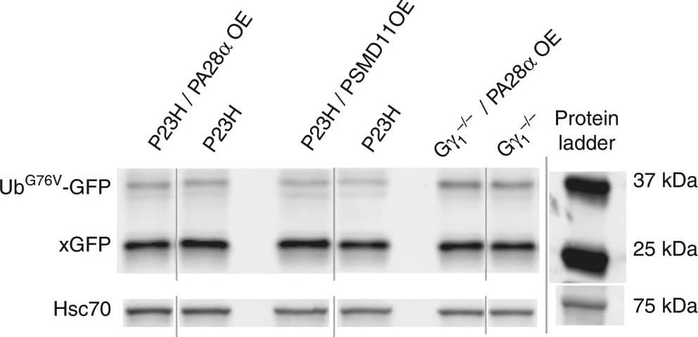 Western Blot: PA28 Activator beta Subunit/PSME2 Antibody [NB120-2940] - Overexpression of PA28 alpha or PSMD11 does not affect accumulation of the UbG76V-GFP reporter. The UbG76V-GFP reporter was detected in retinal ...read more