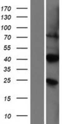 This product is intended for use as a positive control in Western Blot. Overexpression of the target protein was confirmed using an antibody to DDK (FLAG) epitope tag ( NBP1-71705) present on the protein construct. Each vial of cell lysate contains 100ug of total protein which should be sufficient for 20-50 reactions. Depending on over-expression level, antibody affinity and detection system, some lysates can go as low as 0.1 ug per load. We recommend starting with 5ug of cell lysate. Add an equal amount of cell lysate and 2X SDS Sample buffer and boil the SDS samples for 10 minutes before loading. |