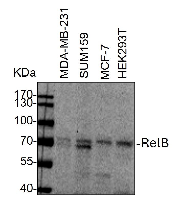 | Immunogen | Recombinant protein encompassing a sequence within the C-terminus region of human RelB. The exact sequence is proprietary. |