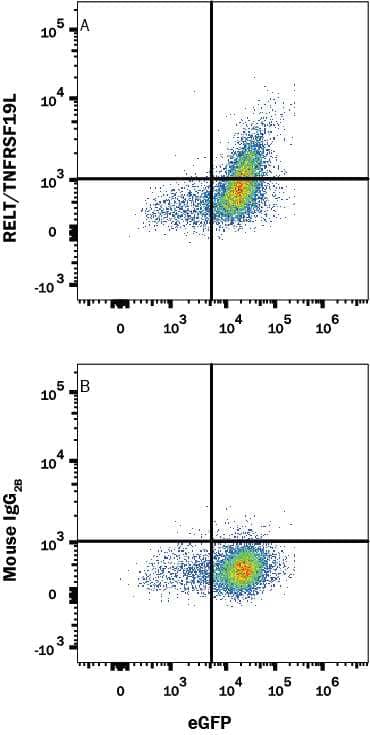 RELT (Receptor Expressed in Lymphoid Tissues) is a type I transmembrane glycoprotein belonging to the tumor necrosis factor receptor superfamily (TNFRSF) and has been designated TNFRSF19-like (TNFRSF19L) (1, 2). It is primarily expressed in hematopoietic tissues and peripheral blood leukocytes. Human RELT cDNA encodes a 430 amino acid (aa) residue precursor protein with a putative 26 aa signal peptide, a 136 aa extracellular domain containing one TNF receptor cysteine-rich domain and one potential N-linked glycosylation site, a 21 aa transmembrane domain and a 247 aa cytoplasmic region containing no death domain. Human RELT shares 85% and 96% aa sequence homology with mouse RELT (Accession # BAC40459) and macaque RELT (Accession # Q9N092), respectively. Among TNFRSF members, the RELT extracellular domain is most closely related to that of TNFRSF19 and OX40. RELT has been shown to exclusively bind the adaptor protein TNF receptor-associated factor 1 (TRAF1). However, it has also been shown to activate the NF-kappa B pathway independently of TRAFs. Immobilized RELT can co‑stimulate T‑cell proliferation in the presence of CD3 signaling, suggesting a potential regulatory role in immune response.