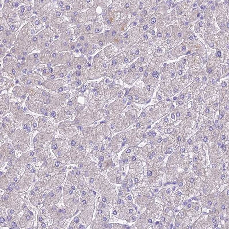 Staining of human liver shows no positivity in hepatocytes as expected.
