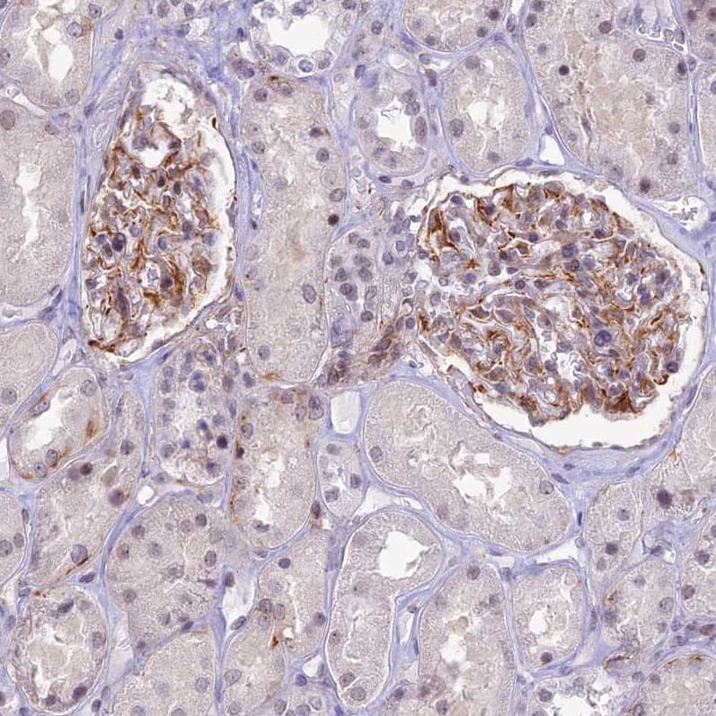 Staining of human kidney shows moderate cytoplasmic membranous positivity in cells in glomeruli.