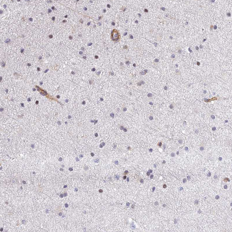 Staining of human cerebral cortex shows moderate cytoplasmic membranous positivity in endothelial cells.
