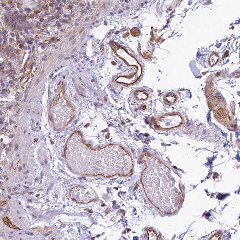 Staining of human colon shows moderate cytoplasmic membranous positivity in endothelial cells.