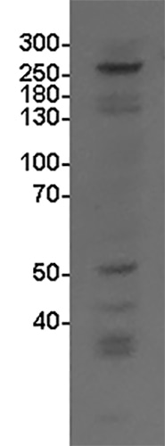 | Theoretical MW | 303 kDa. Disclaimer note: The observed molecular weight of the protein may vary from the listed predicted molecular weight due to post translational modifications, post translation cleavages, relative charges, and other experimental factors. |