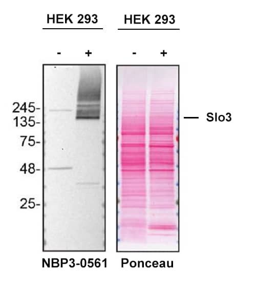 | Immunogen | Recombinant fusion protein containing a sequence corresponding to amino acids 920-1149 of human Slo3 (NP_001027006.2). LELLQMLVTGGVSSQLEQHLDKDKVYGVADSCTSLLSGRNRCKLGLLSLHETILSDVNPRNTFGQLFCGSLDLFGILCVGLYRIIDEEELNPENKRFVITRPANEFKLLPSDLVFCAIPFSTACYKRNEEFSLQKSYEIVNKASQTTETHSDTNCPPTIDSVTETLYSPVYSYQPRTNSLSFPKQIAWNQSRTNSIISSQIPLGDNAKENERKTSDEVYDEDPFAYSEPL |