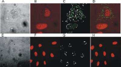 Method used for ICC: MAb to Smac/DIABLO (clone 9H10) was used at a dilution of 1:100 (in C, phase contrast in A, staining with PI in B, overlay with PI shown in D), but the optimal concentration needs to be determined individually. Cells were fixed with 4% PFA and permeabilized with 0.1-0.3% saponin, followed by incubation with an anti-rat-ALEXA490 conjugated antibody (Molecular Probes). Staining with a negative control (rat IgG) is shown in E to H.