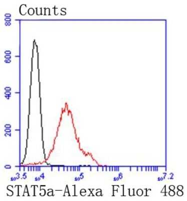 Stat5 is part of a 7 protein family known as signal transducer and activator of transcription (STAT) which contributes to signal transduction by cytokine, hormone and growth factor (1). Signal transducer and activator of transcription 5 (Stat5) functions both in signal transduction and activation of transcription. It has been found that cytoplasmic Stat5 is translocated to the nucleus in response to phosphorylation. Stat5 225; tyrosine phosphorylation is activated predominantly by IL2 but also by IL-3, IL-5, IL-7, IL-9, IL-15, G-CSF andGM-CSF(2). Tyrosine phosphorylation is required for DNA-binding activity and dimerization. Serine phosphorylation is also required for maximal transcriptional activity. NCoA-1/SRC-1 acts as a coactivator for both the alpha- and beta-isoforms of Stat5 (3).