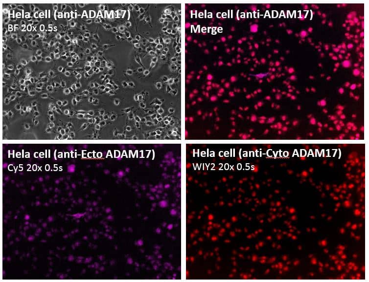 HeLa human cervical epithelial carcinoma cell line was stained with Mouse Anti-Human TACE/ADAM17 Ectodomain Alexa Fluor® 647-conjugated Monoclonal Antibody (Catalog # FAB9301R, filled histogram) or isotype control ...read more