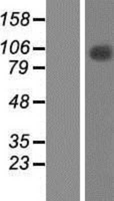 This product is intended for use as a positive control in Western Blot. Overexpression of the target protein was confirmed using an antibody to DDK (FLAG) epitope tag ( NBP1-71705) present on the protein construct. Each vial of cell lysate contains 100ug of total protein which should be sufficient for 20-50 reactions. Depending on over-expression level, antibody affinity and detection system, some lysates can go as low as 0.1 ug per load. We recommend starting with 5ug of cell lysate. Add an equal amount of cell lysate and 2X SDS Sample buffer and boil the SDS samples for 10 minutes before loading. |