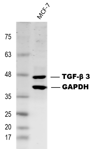 TGF-beta 3 (transforming growth factor beta 3) is one of three closely related mammalian members of the large TGF-beta superfamily that share a characteristic cystine knot structure (1‑7). TGF-beta 1, -2 and -3 are highly pleiotropic cytokines that are proposed to act as cellular switches that regulate processes such as immune function, proliferation and epithelial-mesenchymal transition (1‑4). Each TGF-beta isoform has some non-redundant functions; for TGF-beta 3, mice with targeted deletion show defects palatogenesis and pulmonary development (2). Human TGF-beta 3 cDNA encodes a 412 amino acid (aa) precursor that contains a 20 aa signal peptide and a 392 aa proprotein (8). A furin-like convertase processes the proprotein to generate an N-terminal 220 aa latency-associated peptide (LAP) and a C-terminal 112 aa mature TGF- beta 3 (8, 9). Disulfide-linked homodimers of LAP and TGF-beta 3 remain non-covalently associated after secretion, forming the small latent TGF-beta 3 complex (8‑10). Covalent linkage of LAP to one of three latent TGF-beta binding proteins (LTBPs) creates a large latent complex that may interact with the extracellular matrix (9, 10). TGF-beta is activated from latency by pathways that include actions of the protease plasmin, matrix metalloproteases, thrombospondin 1 and a subset of integrins (10). Mature human TGF-beta 3 shows 100%, 99% and 98% aa identity with mouse/dog/horse, rat and pig TGF-beta 3, respectively. It demonstrates cross-species activity (1). TGF-beta 3 signaling begins with high-affinity binding to a type II ser/thr kinase receptor termed TGF-beta RII. This receptor then phosphorylates and activates a second ser/thr kinase receptor, TGF-beta RI (also called activin receptor-like kinase (ALK) -5), or alternatively, ALK-1.This complex phosphorylates and activates Smad proteins that regulate transcription (3, 11, 12). Contributions of the accessory receptors betaglycan (also known as TGF-beta RIII) and endoglin, or use of Smad-independent signaling pathways, allow for disparate actions observed in response to TGF-beta in different contexts (11).