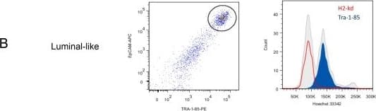 Flow cytometry analysis of total cell fractions of dissociated cells from PDX models.A) Basal-like xenograft cells. B) Luminal-like xenograft cells. A and B displays pseudo-color dot plots (left panels) and histograms ...read more