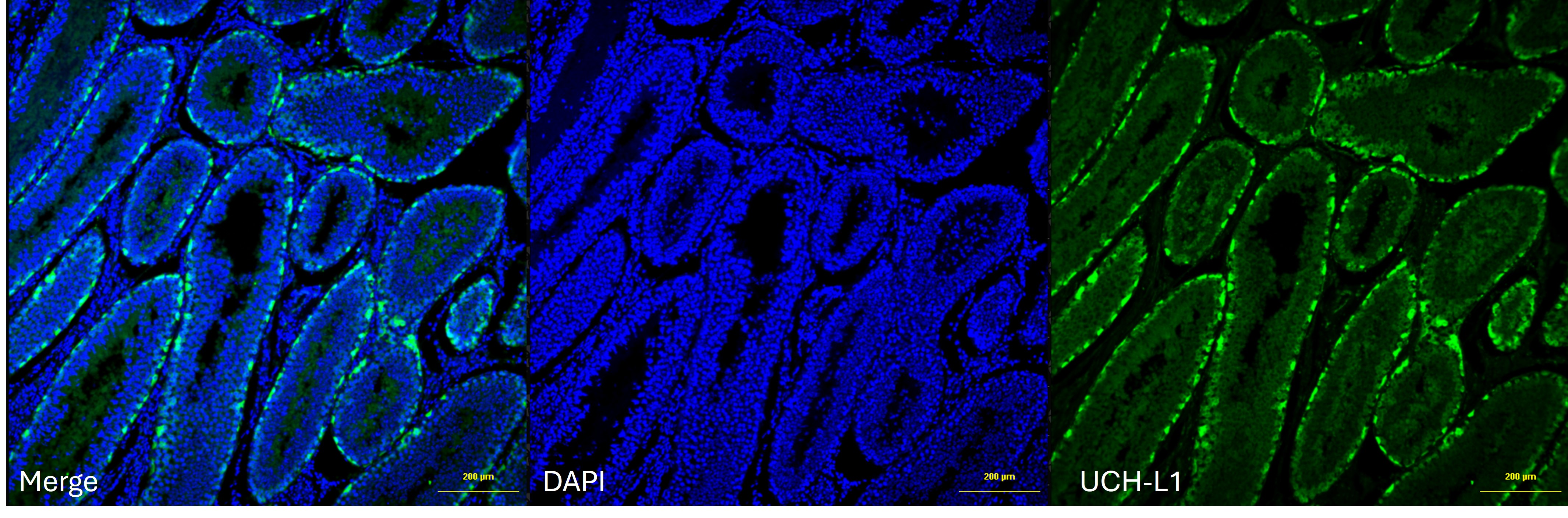 UCH-L1/PGP9.5 Antibody on bovine adult testis at 1:100. Image from a verified customer review.