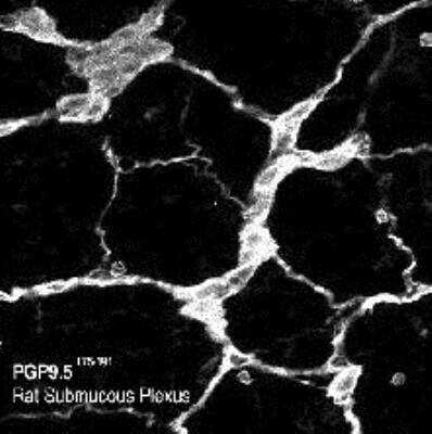 PGP9.5 is a soluble cytoplasmic protein with a molecular weight of approximately 25,000 kD. It is present in neurons and in cells of the diffuse neuroendocrine system. PGP9.5 functions as a tissue-specific ubiquitin carboxyl terminal hydrolase isoenzyme. This enzyme is also known as UCH-L1. Because of its abundance in nerves, it has been widely used as a marker for peripheral nerve fibers