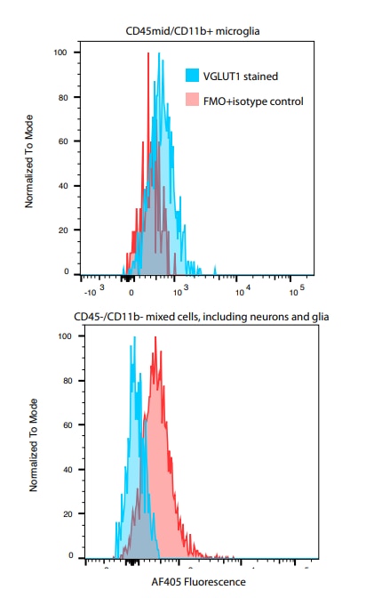 Single cell suspensions were prepared from mouse brain from 1 year old 5xFAD mice using enzymatic digestion and a 27% percoll gradient to clear myelin. Cells were then stained for CD45 and CD11b, fixed and permeabilized, and then stained with the ant-vglut1 antibody for 30 minutes at room temperature. ***Bio-Techne Response: This review was submitted through the legacy Novus Innovators Program, reflecting a new species or application tested on a primary antibody.***