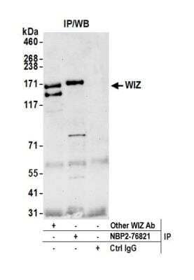 The epitope recognized by NBP2-76822 maps to a region between residue 1601 and 1651 of human Protein Wiz using the numbering given in entry O95785.2 (GeneID 58525). |